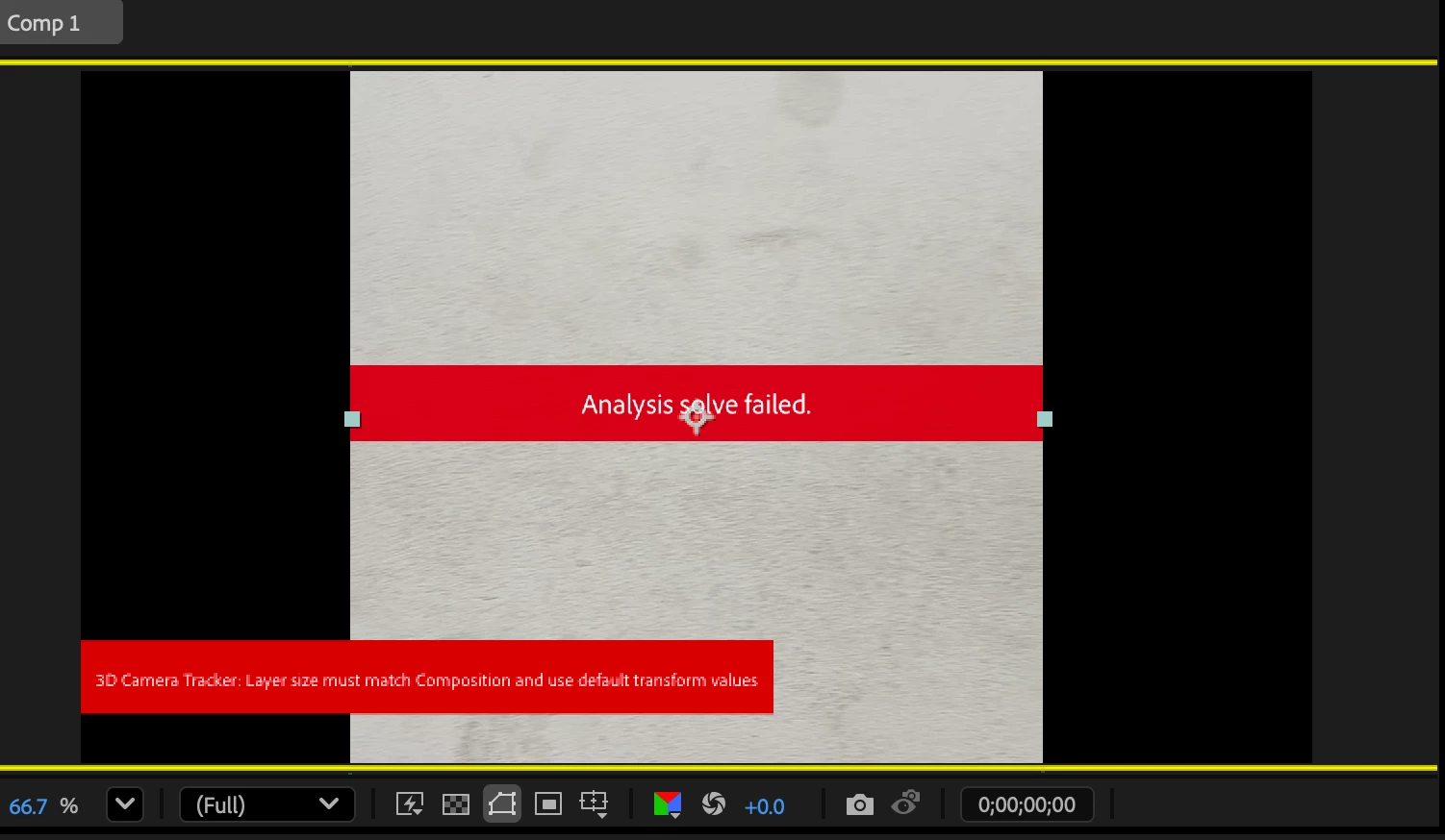 I get an error message as 'Analysis solve failed' and then '3D Camera Tracker Layer Size must match composition and use default transform values'