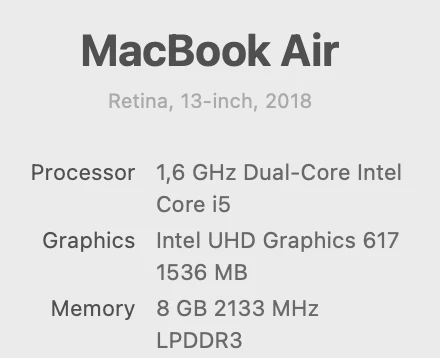 • 1.6 GHz Dual-Core i5 • Intel UHD Graphics 617 • 8GB RAM