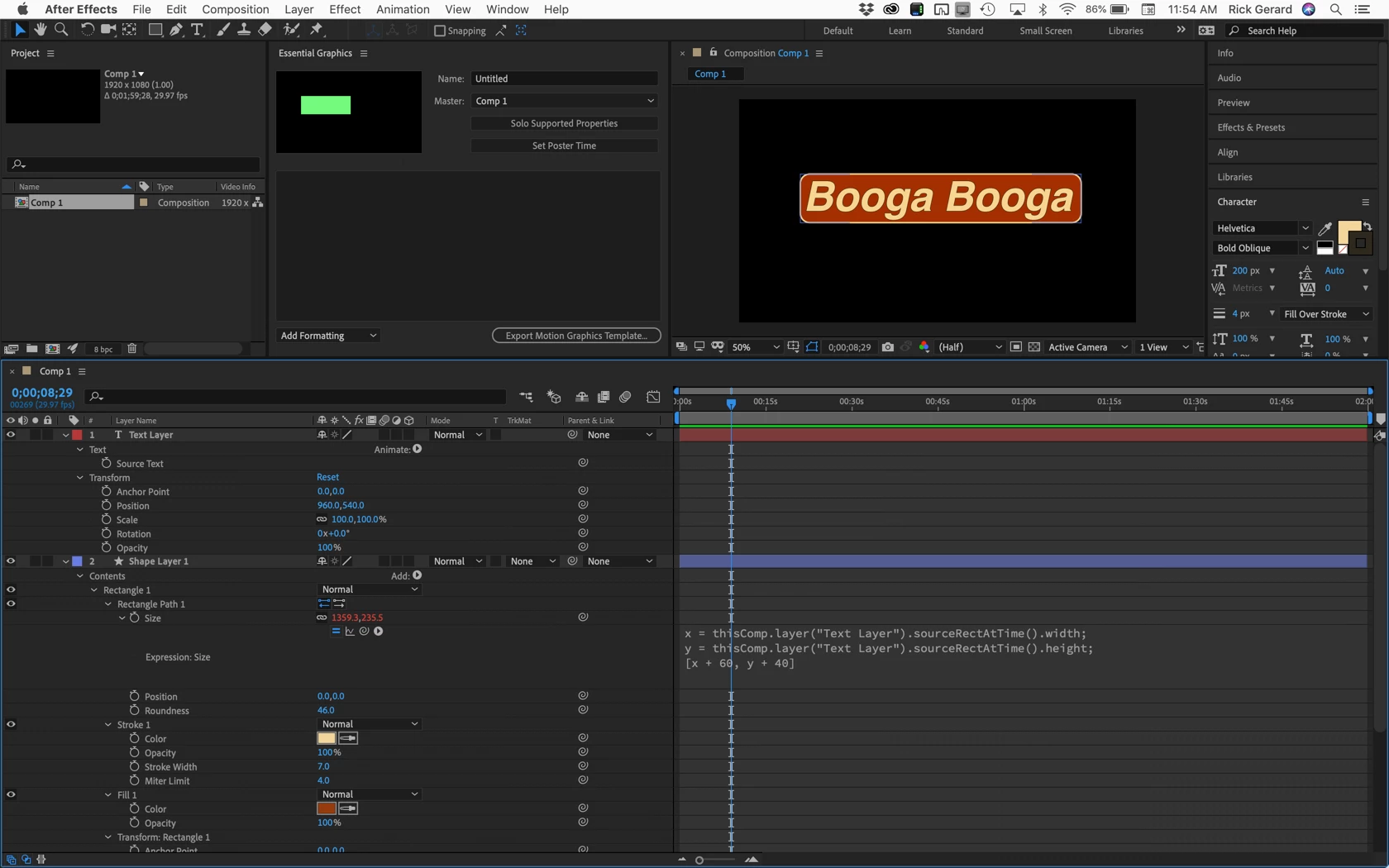 With a few modifications, the basic two first variables [x, y] can be used to position, size, and even expand a shape layer to use as a background in the Essential Graphics process. Here's the first step, I'm showing the soloed properties that can be animated using Essential Graphics.