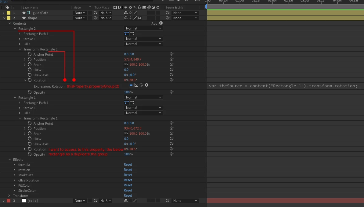 I want to access the rotation property of a rectangle below, the easiest way is to use the pick whip, but it will always access the same “Rectangle 1”. I want to duplicate the group several times and always take the rotation of a rectangle below, not the "rectangle 1"