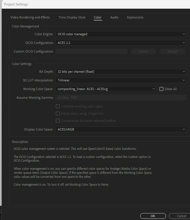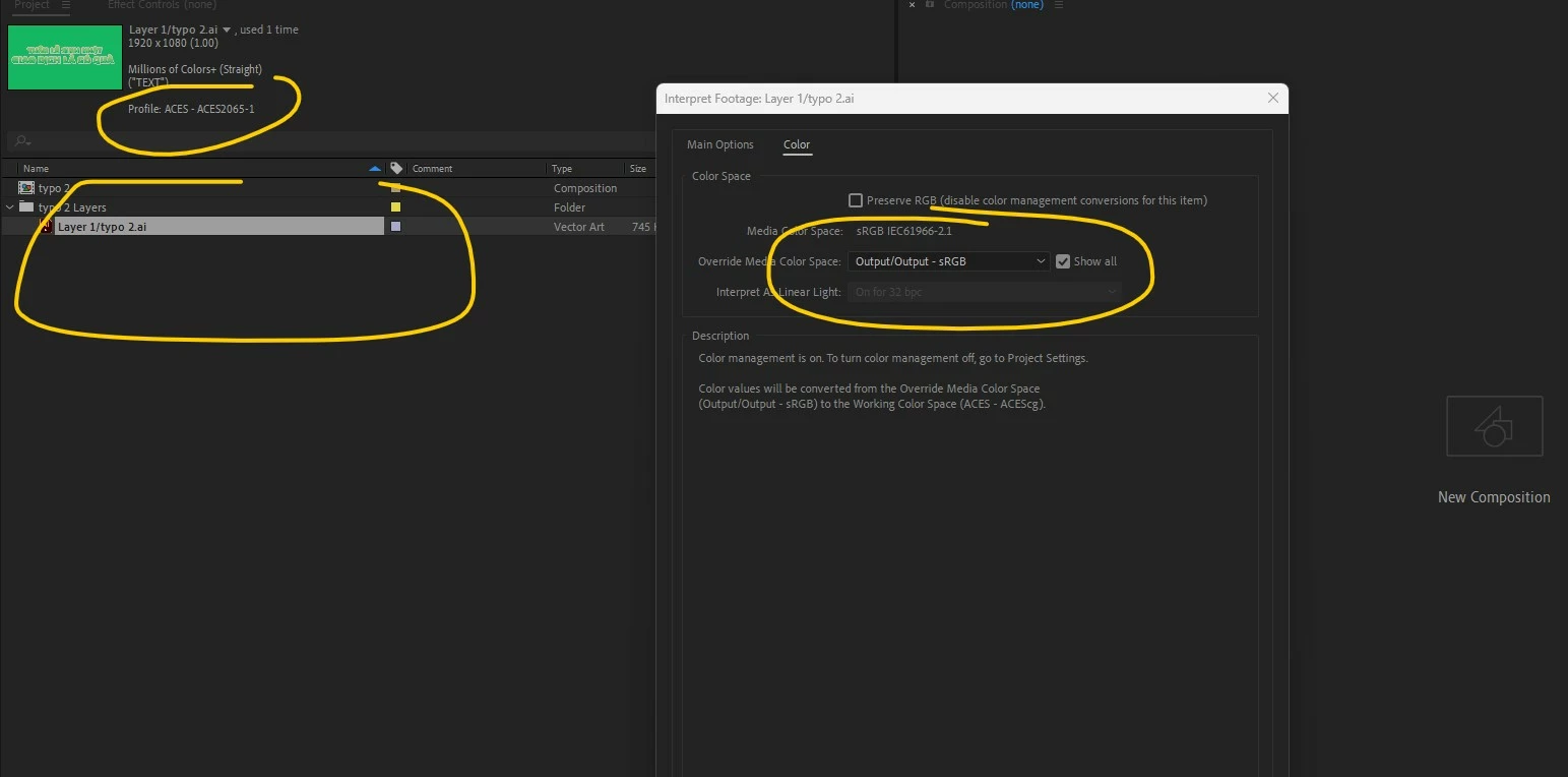 hi i am using After effects 2023 with "Acescg workflow". When I import the AI file into AE the color is not correct. do i convert "Color engine" of Ai file to SRGB . THANKS