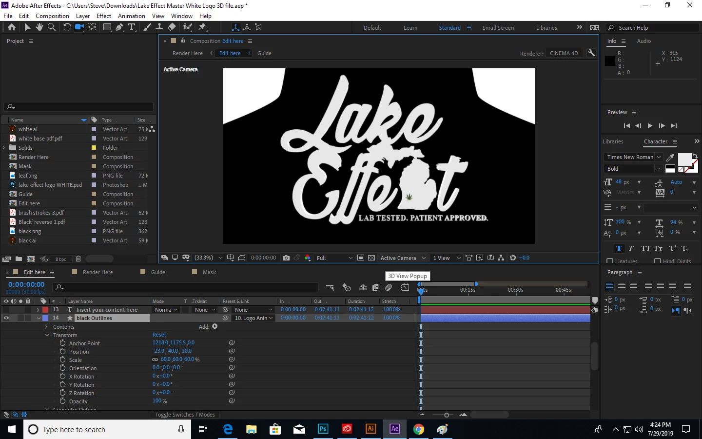 So to answer the last question, first, if I solo the black brush strokes layer (which is an extruded shape layer) then you can’t see the image because it’s got no background (the “view“ of background in the absence of a layer is also black.if I try to select two views it gives me an error message “After Effects error: invalid camera view index ( 26 : : 327 )”.