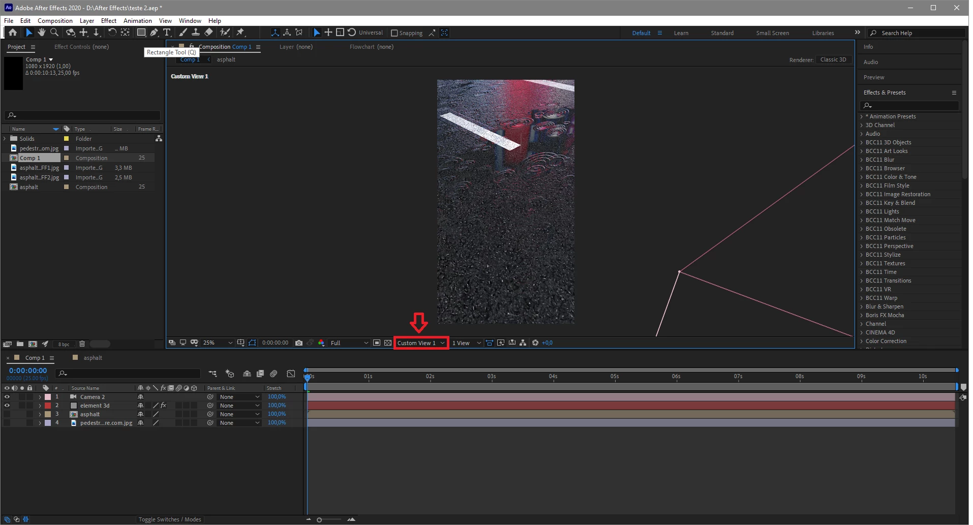- When I add a 3D camera to my project element, in "active camera" it doesn't work and not showing, only in "camera view 1" working