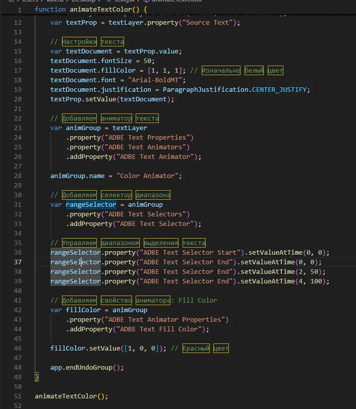 Please tell me, I'm trying to write a script that will create a text layer and add a color animator there, so that I can change the color in certain words from a sentence, but every time I do this, I get a null error in the line of code where rangeSelector is used.