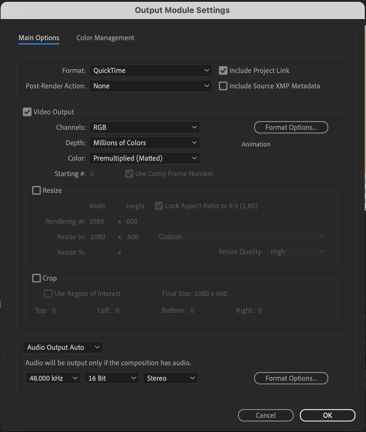 My latest composition I need to be RGB + ALPHA but when I add to render queue, it outputs as a static .mov. It is a 5 second comp with a basic track matte with position keyframe. I can output ok in Adobe Rende Queue but need the transparent background .Screenshots attached.