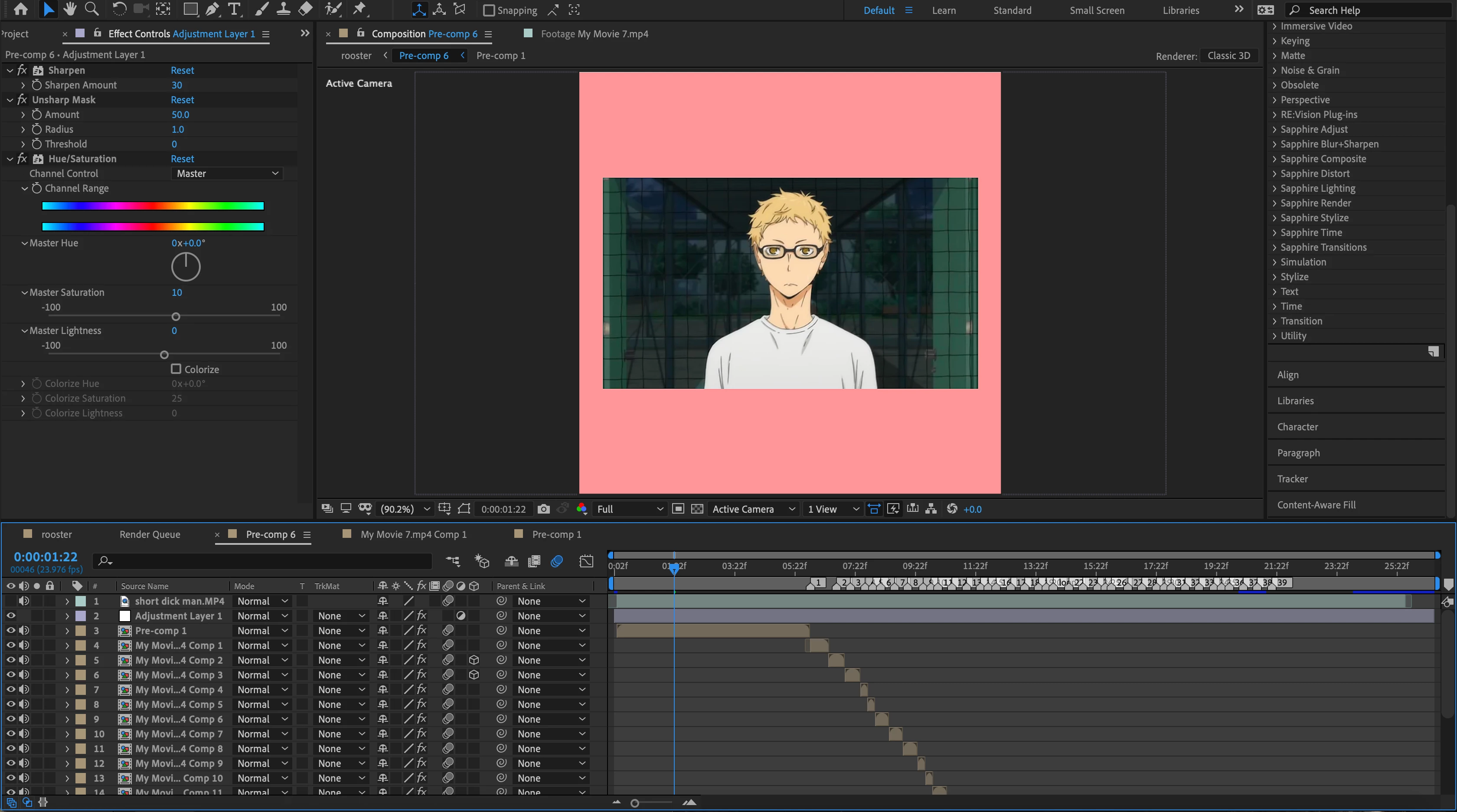- adding the effects (sharpen, unsharp mask, saturation) straight to the clips or pre compositions