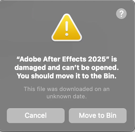 “Adobe After Effects 2025” is damaged and can’t be opened. You should move it to the Bin.