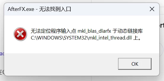 It should be noted that there will be no error when starting from Adobe Creative Cloud, but if it is started from a shortcut, or even running AfterFX.exe directly from the software installation directory, an error will still appear. The dll file mentioned in the error message exists. The error message is as follows: