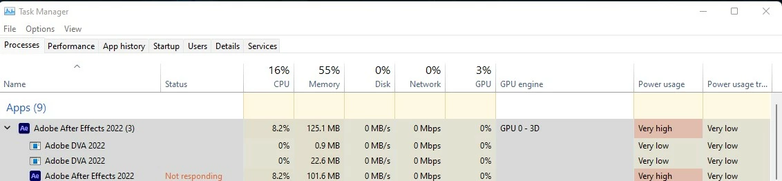 After launching after effects, task manager shows it is non responsive after a few seconds. There is one (sometimes 2) other process called ' Adobe DVA 2022'. Although when right clicking -> open file location on Adobe DVA 2022 process, one shows dynamiclinkmanager.exe while the other shows crashpad_handler.exe even though the process is titled Adobe DVA 2022 in task manager.