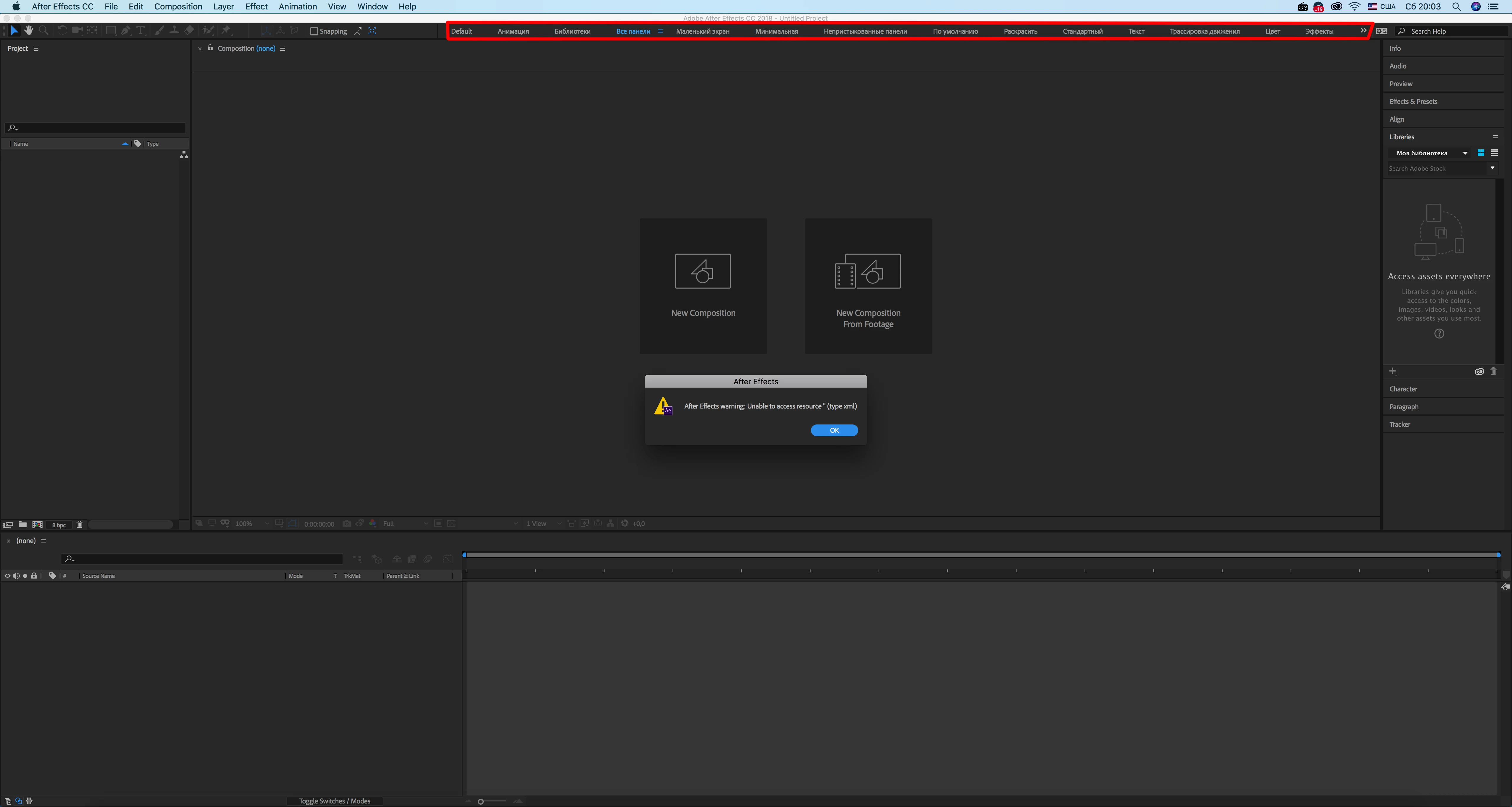 Adobe After Effects warning: Unable to access to resource " (type to xml)