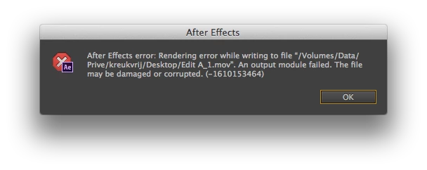 After Effects error: Rendering error while writing file "xxx". An output module failed. The file may be damaged or corrupted. (-1610153464)