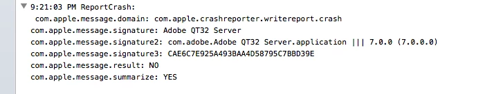I checked the Console and was able to find a message leading me to confirm the Adobe QT32 Server was crashing. After scanning Activity Monitor for other apps using the same port my eye caught AirServer.