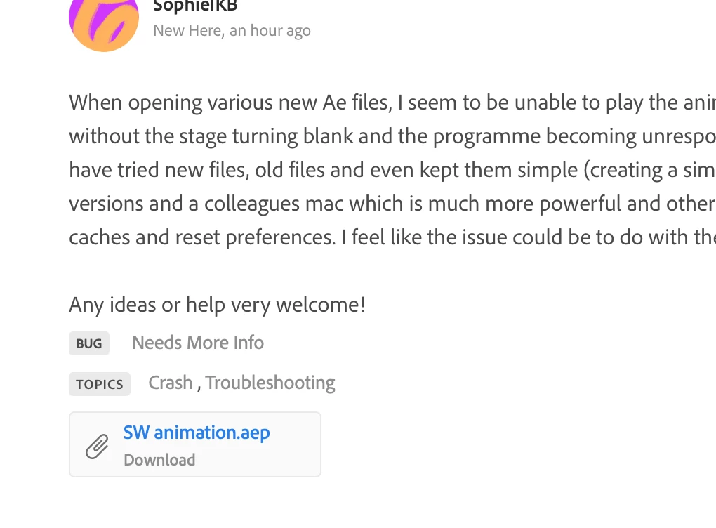 When opening various new Ae files, I seem to be unable to play the animation back more than once (after starting and stopping) without the stage turning blank and the programme becoming unresponsive. Ae has no 3rd party plug-ins, only overlord used. I have tried new files, old files and even kept them simple (creating a simple vector circle) and this still happens. Even tried older versions and a colleagues mac which is much more powerful and others have tried and get the same issue too. I have cleared caches and reset preferences. I feel like the issue could be to do with the Ae project settings perhaps??