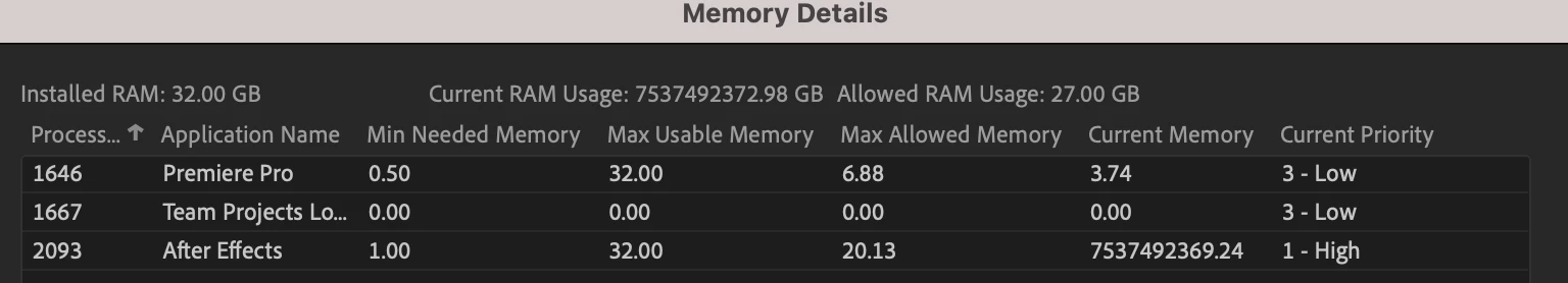 Basically, I'm working on a project using some green screen with 4K video, and as I'm scrubbing through the timeline, it's consistently crashing. I'm editing in Premiere, and using "Replace with After Effects composition" to do the green screen and masking work. When I check the memory details, I see the attached screenshot, which seems wild to me. By the looks of it, AE is trying to use 7 trillion GB of memory.
