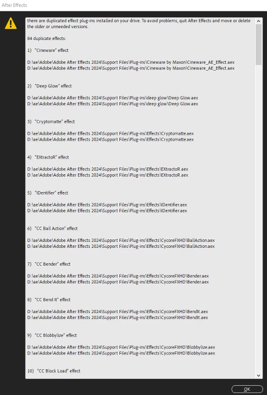 I reinstalled After Effects but nothing changed. No duplicate plugins were found in the paths, nor in the MediaCore folder. I updated the drivers, but still the same. The forums advised installing Visual Studio 2013 but this was also in vain. I hope there is an answer, AE works itself but it’s annoying to constantly receive this window.