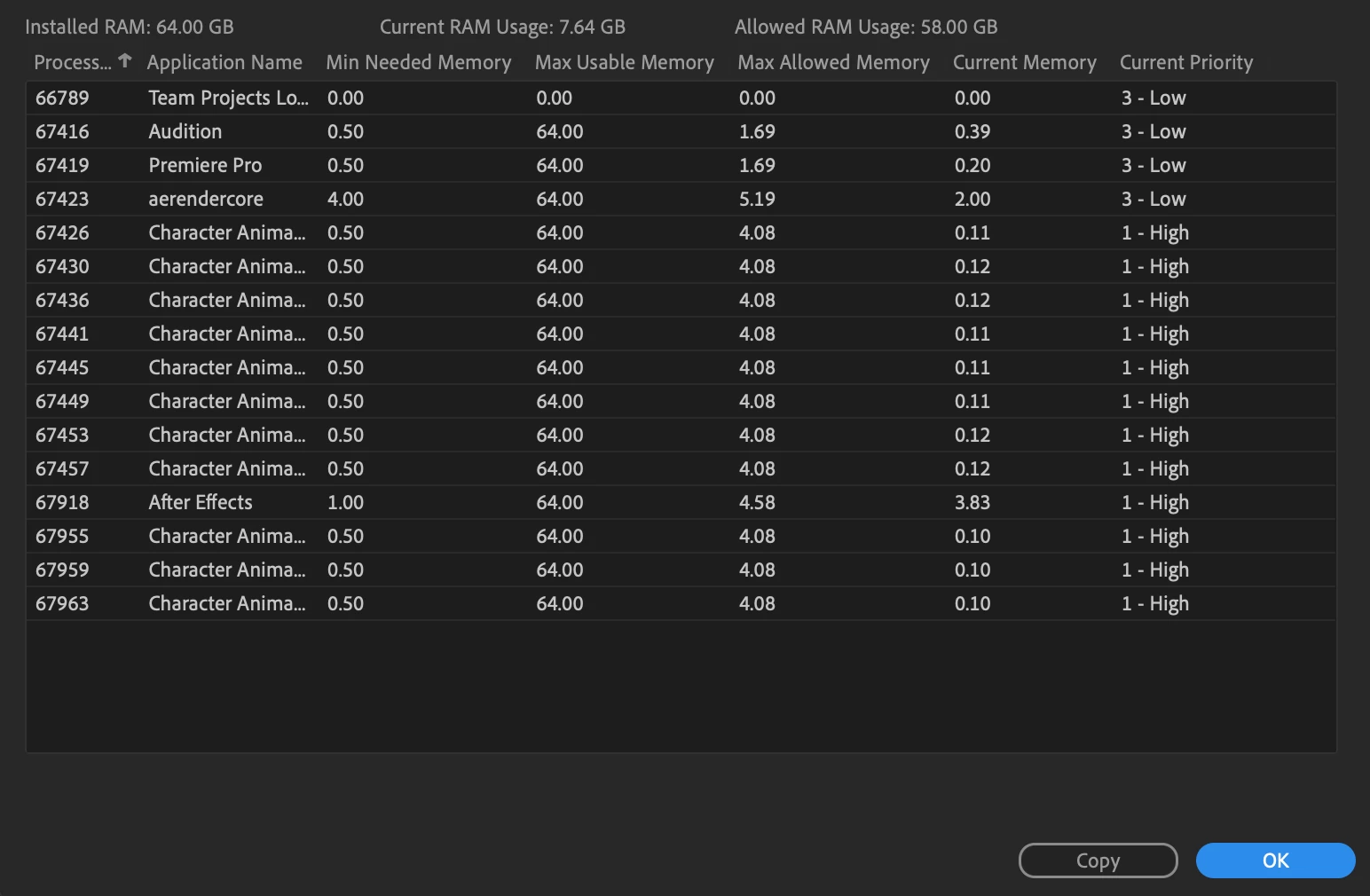 I'm using AE+Premiere+Audition+Character Animator via dynamic link. I've got a handful of Ch headless processes (11 @ 200MB memory each), After effects with 4.3GB, Premiere with 1GB, and Audition with 600MB. You can do the math if you like, but my system RAM is only half used according to Activity Monitor (35GB across all active processes, not just adobe stuff). Nevertheless, AE is giving me a low memory warning and struggling to load previews. What's going on?
