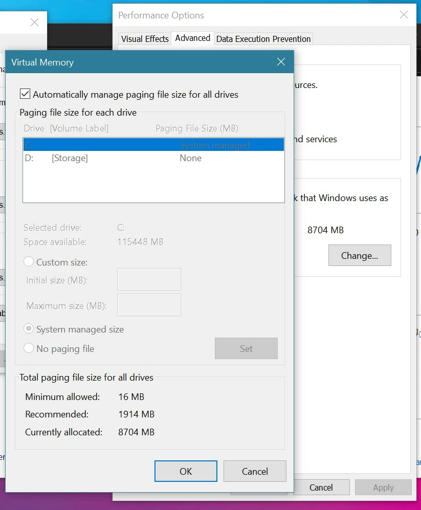 Please enable your Windows swap file in automatic mode
