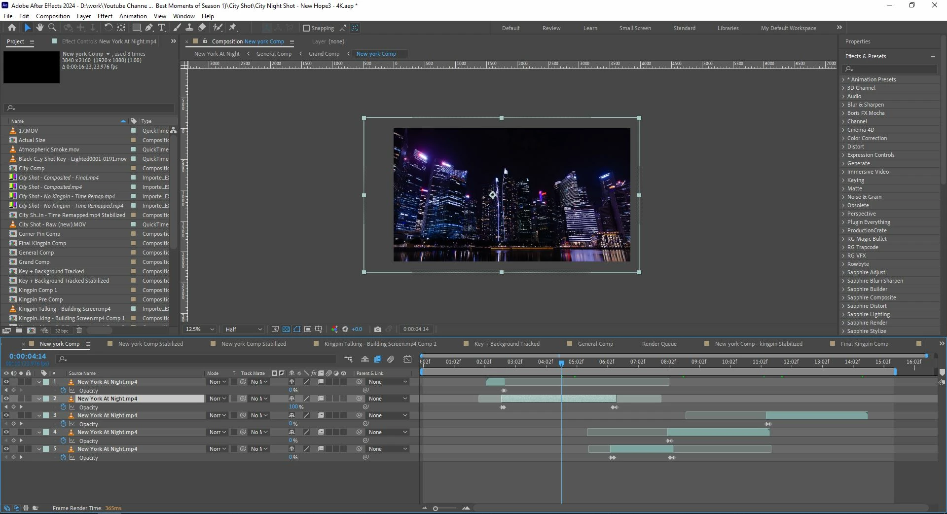 After a while it dawned on me that the background clip I want to use is with a different frame rate (23.98) than the green screen shot I’m tracking (25), so I interpreted the green screen shot in AE to be 23.98 too, but that didn’t make a difference. I turned off the motion blur I had added earlier to see if it would turn out to be the issue, but with no difference. While the main comp’s size is 3840x2160, the background asset clip’s resolution is 4096x2160, but I’ve precomped it to have the standard 4k res and I’ve applied the Mocha track on the precomp, so it shouldn’t be problematic. I also created a precomp for the night city background shot where I prolonged it to reach the necessary length by creating copies and keyframing the opacity. Here are screen recordings and images for reference: