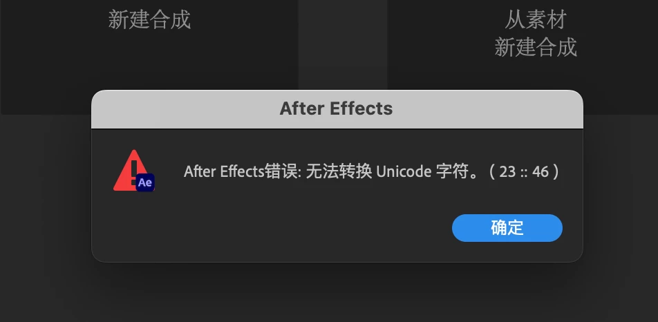 XxushaohuaKnown ParticipantForum|Forum|1 year agoJune 11, 2024QuestionAE2024启动时显示After Effects错误Forum|Forum|1 year agoJune 11, 20241 reply2575 views无法转换 Unicode 字符。(23::46),和After Effects错误:加载 Psuedo 效果失败。 1,AE 24.4.12,MacOS 14.5 M1芯片3,启动AE就会报错,没有项目,已经卸载重装问题依然存在。4,其他,AE2023版本和AEbeta版本正常,不会报错。ChineseHow toError or problemFAQ