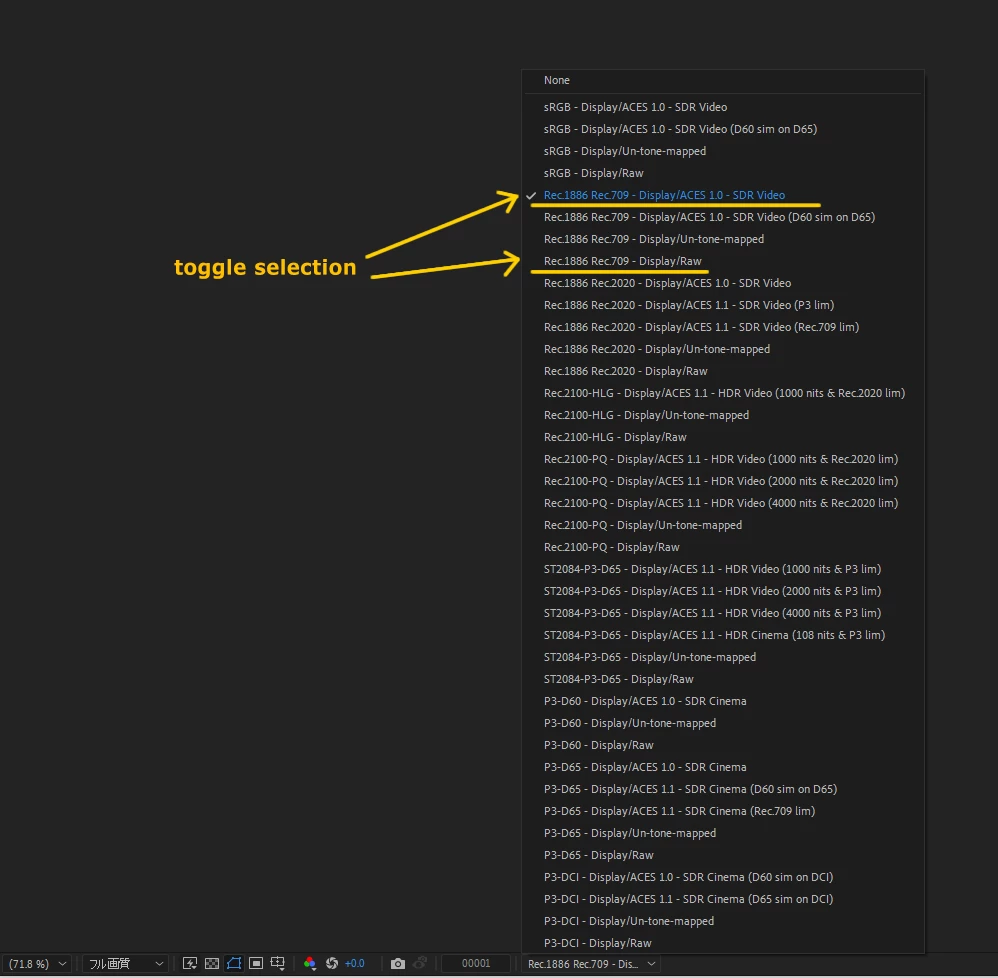 If you set the color engine to [OCIO] in After Effects 2024, you will be able to use [Display Color Space], but this [Display Color Space] cannot be assigned to shortcuts, etc. Is there any way to toggle between color spaces A and B as shown in the image below?