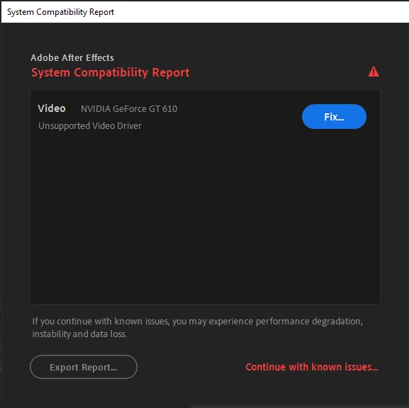 The report that you see is just the notification that your GPU driver is not supported by the Adobe app and could cause crash or performance-related issues. Your GPU looks old and the manufacturer is not releasing new drivers that are compatible by Adobe apps. You can turn off the report from After Effects Preferences > General > uncheck Show system compatibility issues at startup.