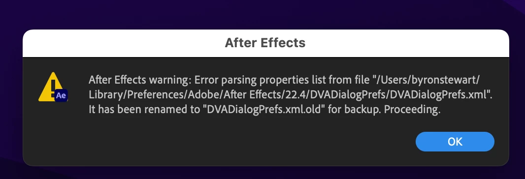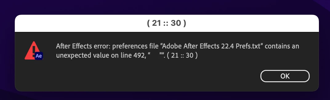 After Effects Error: Prferences files "adobe after Effects 22.4 prefs.text" contains an unexpected value online 492," "".(21::30)