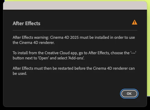 Hi, I installed Adobe After Effects 2025 and also installed all the Cinema 4D related programs, but I still get the warning message that says "Cinema 4D 2025 must be installed in order to use the Cinema 4D renderer." How can I fix this issue?