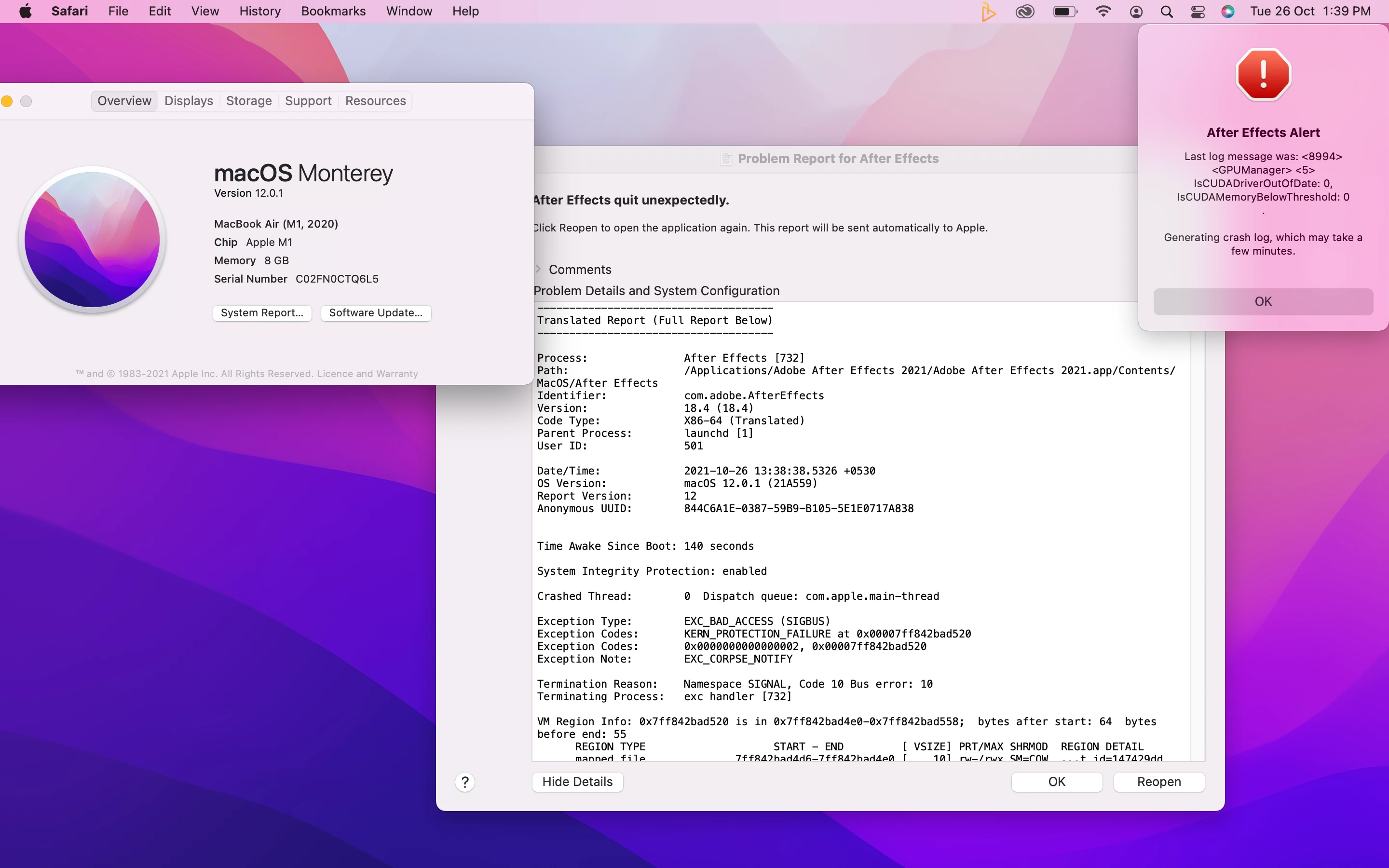 Hello, I have recently updated my Macbook m1 to the macOS monterey after that the after effects 14.0.1 starts crashing on the startup but at the same time all the other adobe apps are working just fine,