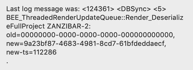 Last log message was: <124361> <DBSync> <5> BEE_ThreadedRenderUpdateQueue::Render_DeserializeFullProject ZANZIBAR-2: old=00000000-0000-0000-0000-000000000000, new=9a23bf87-4683-4981-8cd7-61bfdeddaecf, new-ts=112286"
