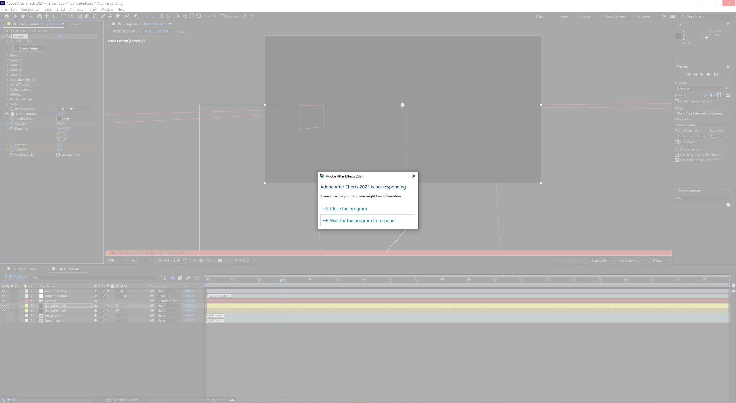 After Effects 2021 crashes with Element 3D templates projects