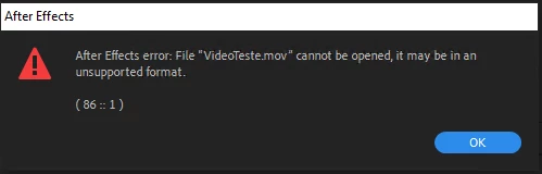 After Effects error: File "VideoTeste.mov" cannot be opened, it may be in an unsupported format. (86::1)