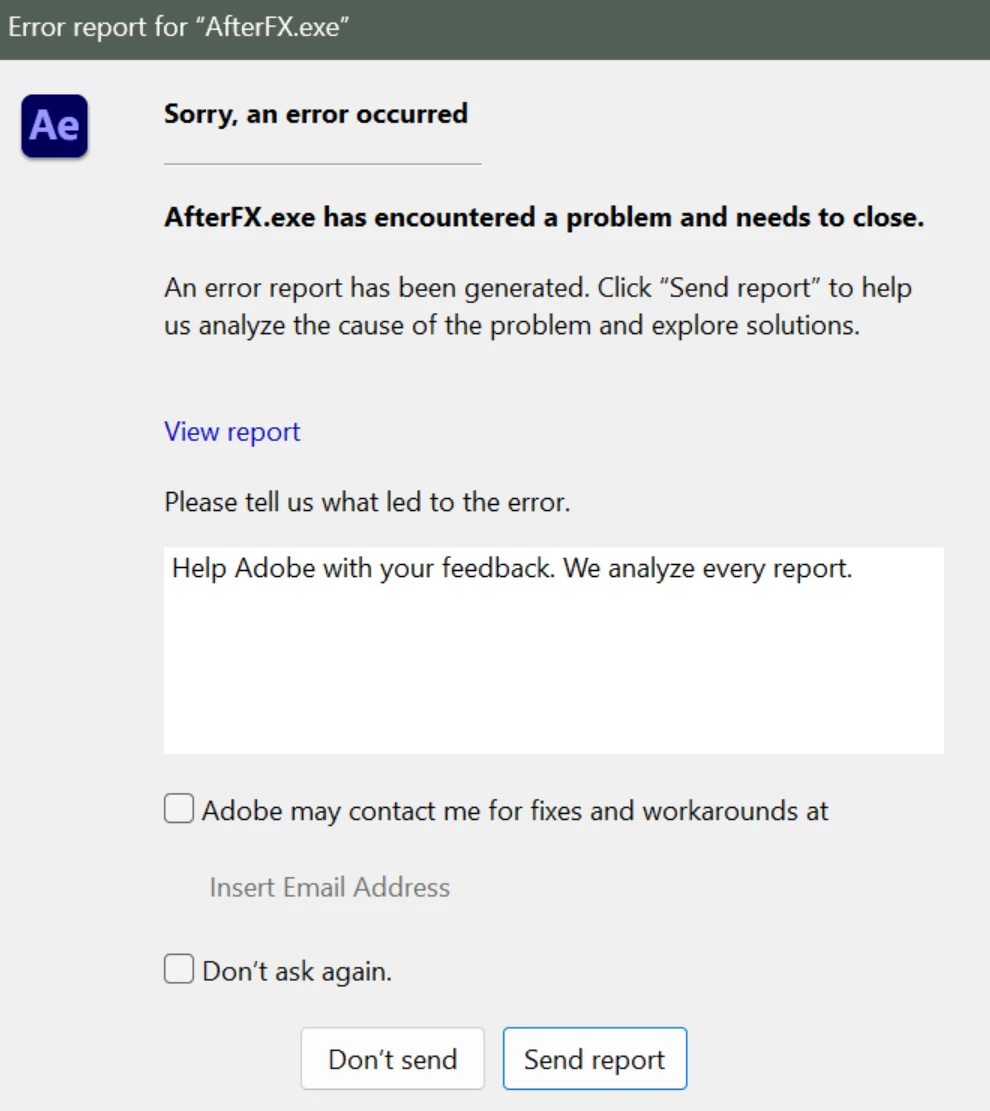 Observe crash dialog: AfterFX.exe has encountered a problem and needs to close.