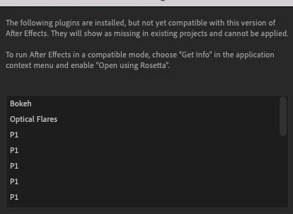 The following plugins are installed, but not yet compatible with this version of After Effects. They will show as missing in existing projects and cannot be applied. To run After Effects in a compatible mode, choose “Get info” in the application context menu and enable “Open using Rosetta”.