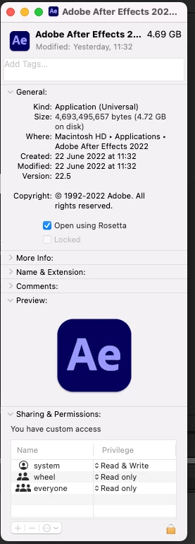 So I enabled “Open using Rosetta” by right clicking on the After Effects application and it loaded up.
