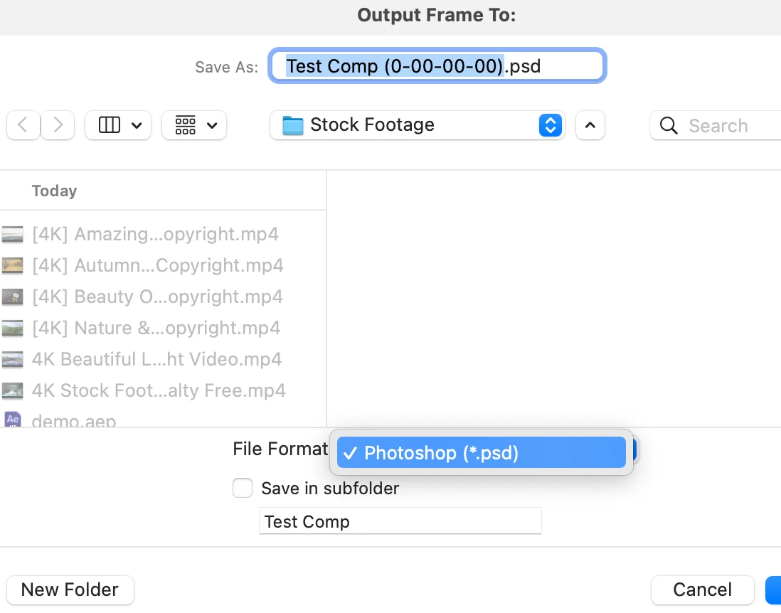 When you click on Composition>Save frame as>File... it no longer takes oyu to the render queue to choose a format. Instead it opens up a "Save As" window where the only option is .psd.