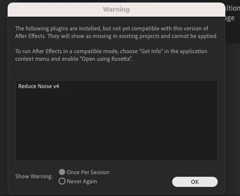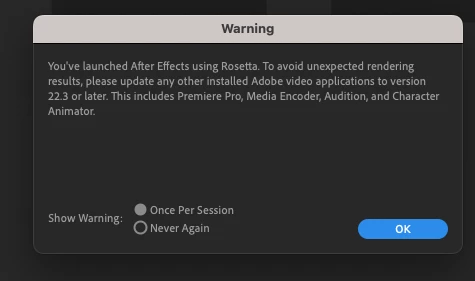 I'm assuming this is a bug.  I've restarted, uninstalled and reinstalled AE and I always get this noticeNot sure what's going on.  I don't use AE that often although I've been working with it for well over 25 years...  Everything mentioned in the warning has been updated to the latest version...   Am I missing something obvious.  Been very happy with my new macstudio which I've had for maybe 6 weeks using Premiere.  Running Ventura 13.4.  Got the entry model with 32 gigs of RAM.   Today, I opened a sequence that had a AE comp in it that was "offline" and when I found the AE project and tried to open it, got this message.  So I started to render out the clip figuring I'd just replace the AE comp with the rendered file (my workflow on my old mac). and got a message that I was out of memory and AE locked up.  First time on the new macstudio...  Was able to restart and render it out... but would like to figure this out...  I searched this forum for anything obvious...