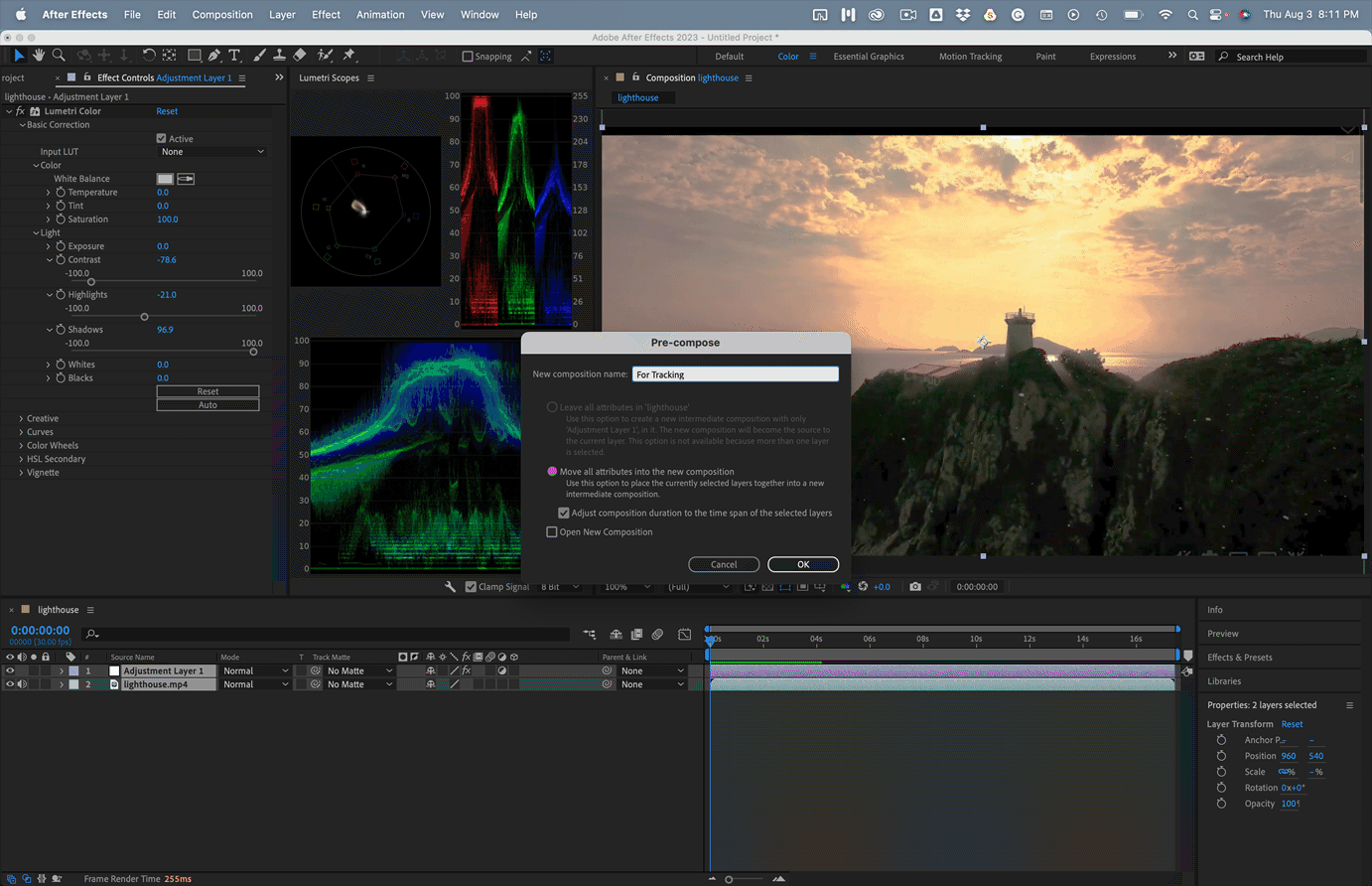 3. Precompose the Adjustment layer and the Footage trimming of the new comp to the layer size