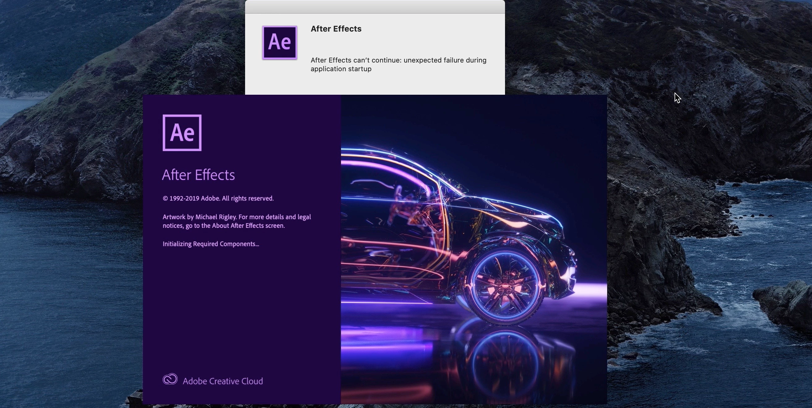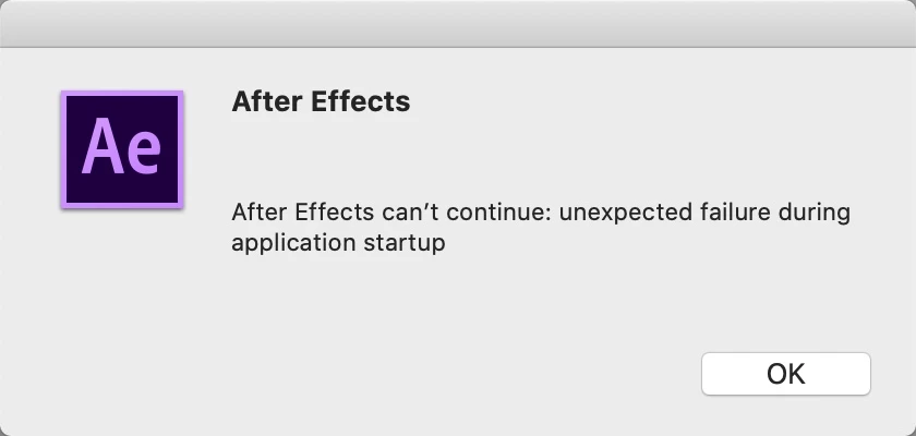 Issue: After Effects 22.3 and 22.4 crashes on start up when running on MacOS versions 10.15.0 through 10.15.3.
