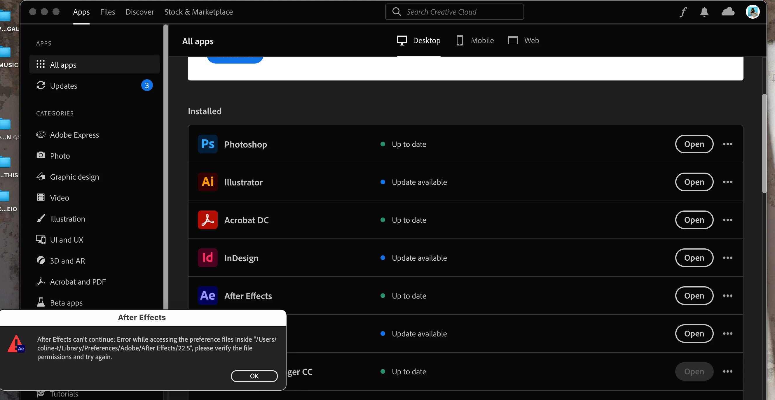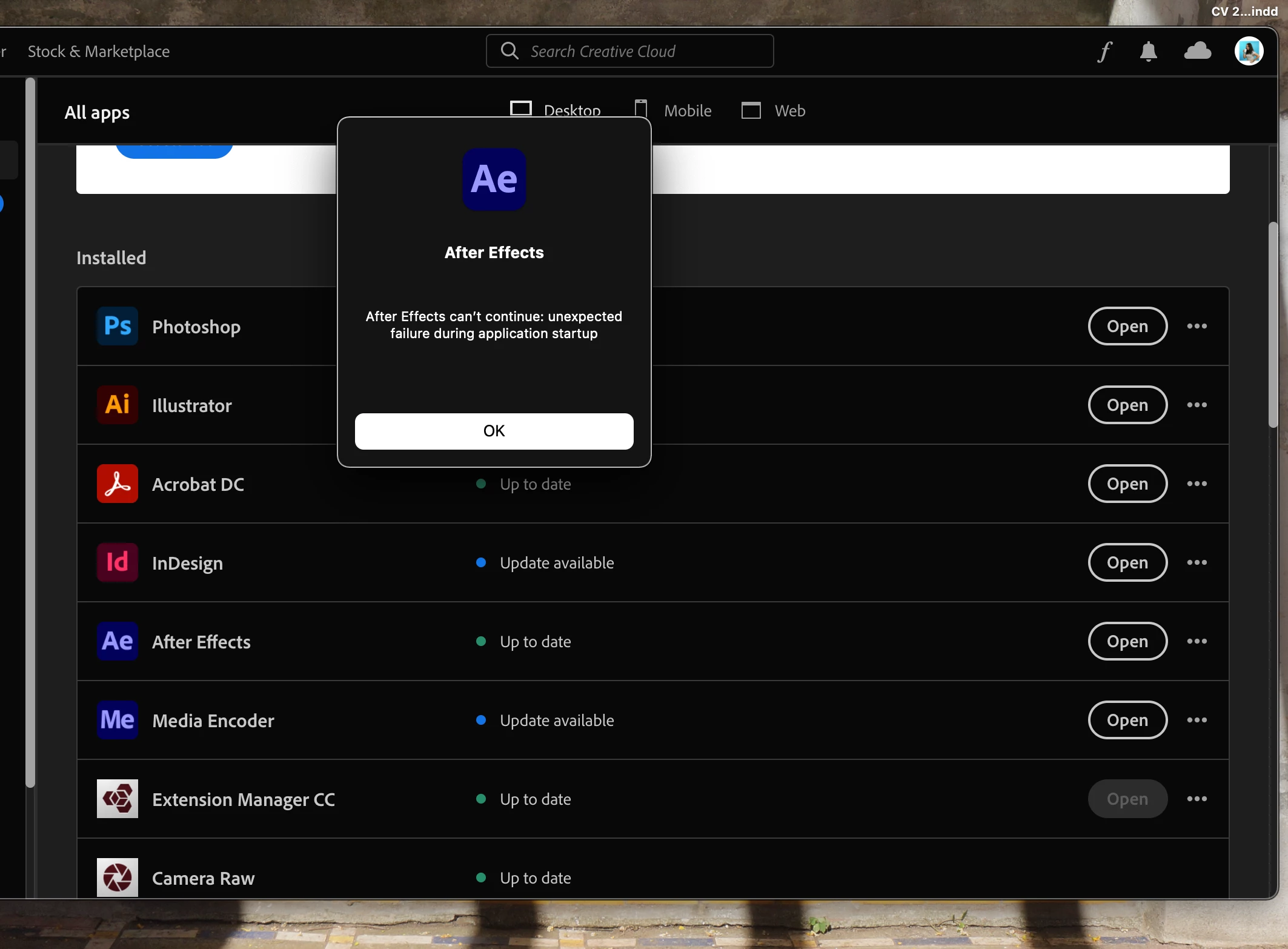 All other's Adobe applications are loading without any issue. The only one that is throwing error is After Effect…