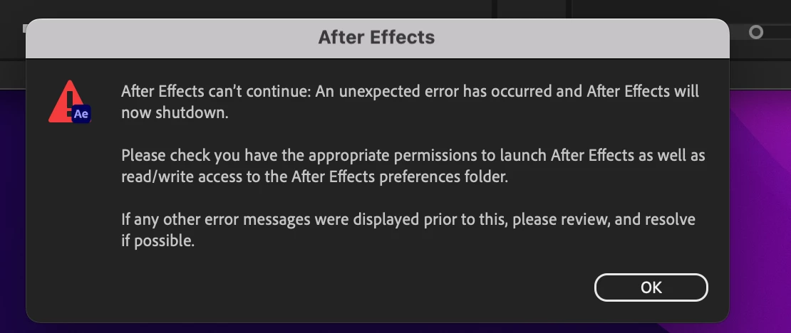 after effects crashed on me just now and when I open it back up it says "after effects cant continue: an unexpected error has occurred and AFter Effects will not shutdown. Please check you have the appropriate permissions to launch After Effects as well as read/write acess to the After Effects preferences folder. If any other error messages were displayed prior to this, please review and resolve if possible." I noticed that AE updated itself last night. Looks like auto updates were turned on. I bet this wouldnt have happened if auto updates were turned off. I cant get back in. Going to need to have someone remote in AGAIN to fix it.