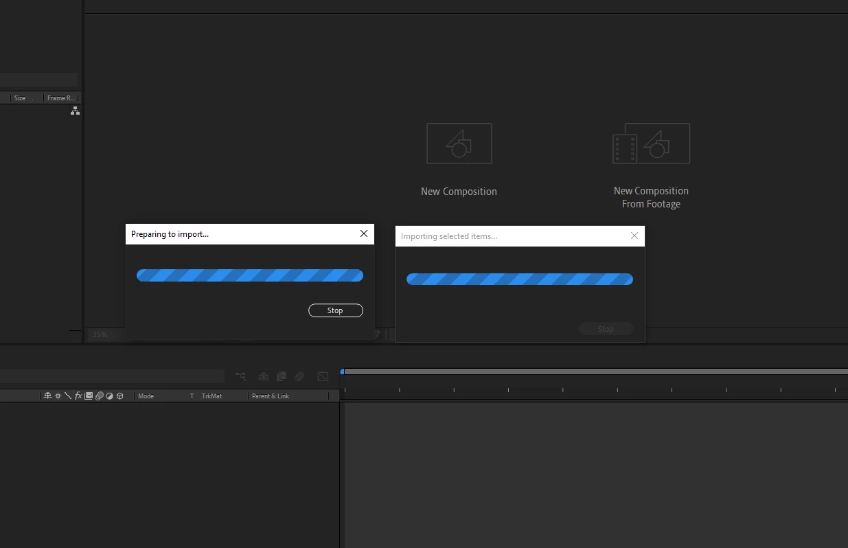 attached is a picture of what happens when I import and it gets stuck and then when I close the panel AE crashes.