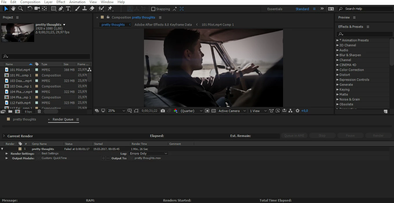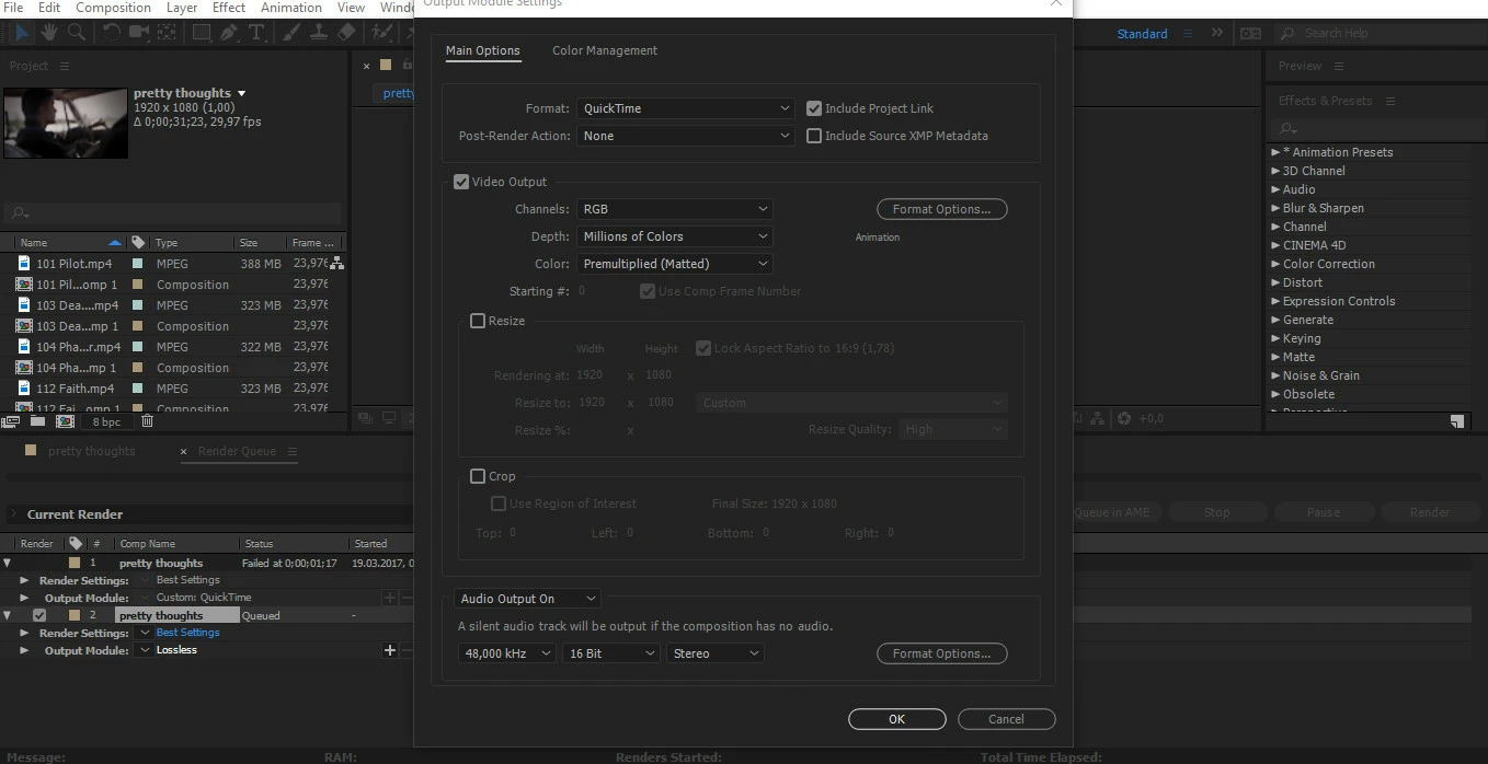 I'm having an issue with rendering a project. I've never had any issues with rendering before so I don't know what the problem is or how to fix it. This project I'm having issues with rendering is much longer than the previous projects I've rendered, so the issue might have got something to do with that. I recently started using after effects so I'm new to everything and don't have much knowledge. After I've added the composition to the render queue, chose the settings and clicked render, when the rendering reaches 0;00;01;17 i hear a sheep noise. Nothing pops up saying what the problem is, it only says "failed at 0;00;01;17" under the status. I've looked at google and watched youtube videos to try and figure out how to fix this problem but I haven't found anything that works. Please help.