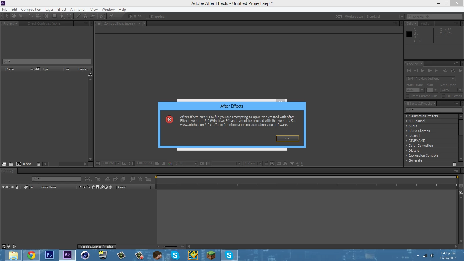 "After Effects error: The file you are attempting to open was created with After effects version 13.0 (Windows 64)