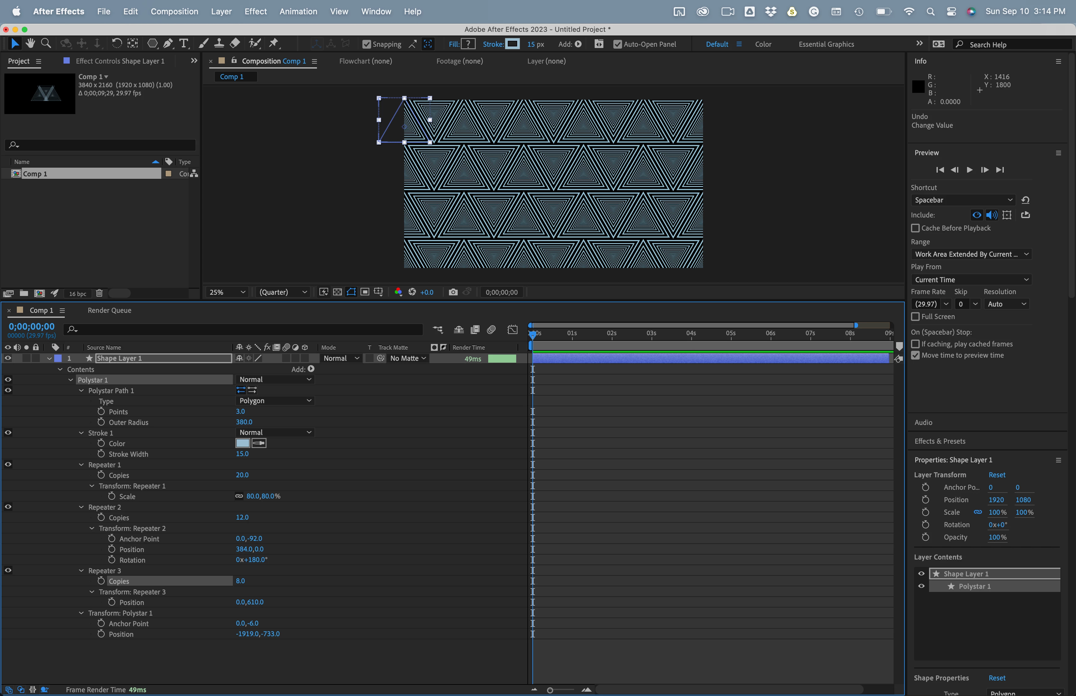 I grab that group and place them in a new comp, the group of shapes that are in the corners I cut with a mask to create an infinite pattern.