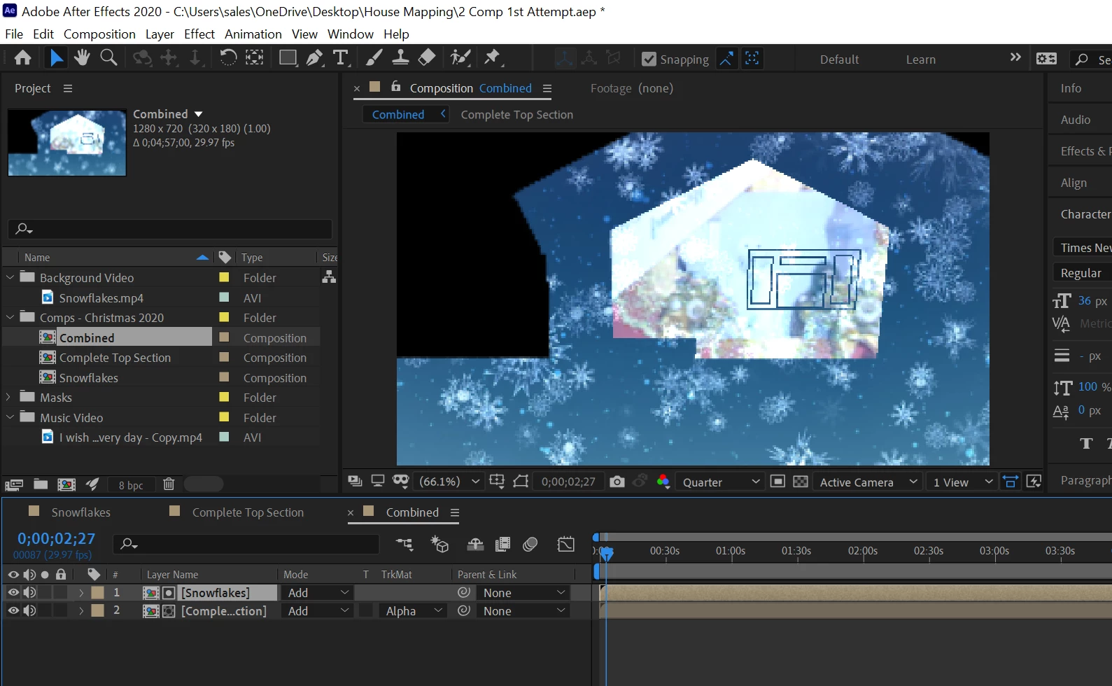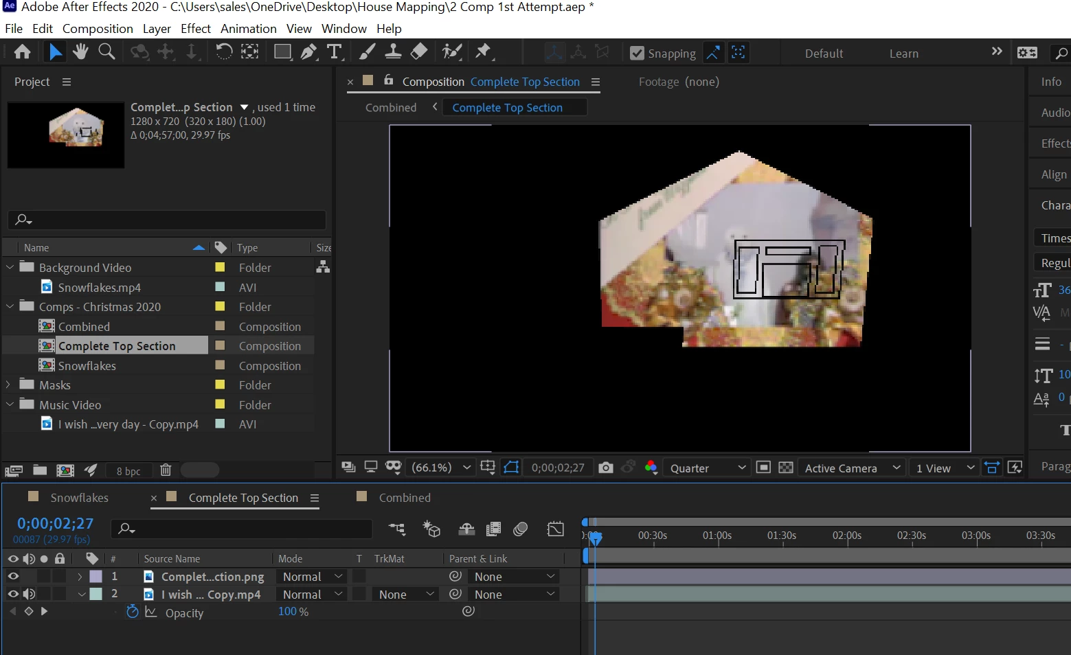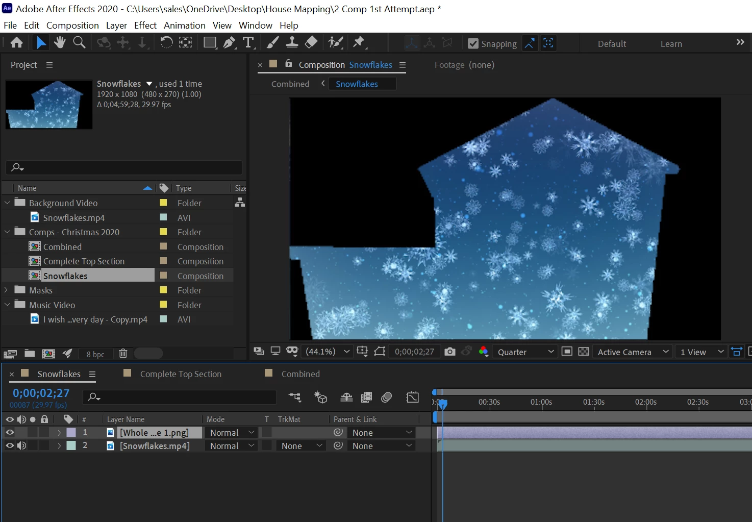 I thought that I had to make 2 compositions up.. 1: The snowflakes masked to the whole house and 2: The music video masked to the area that I want.