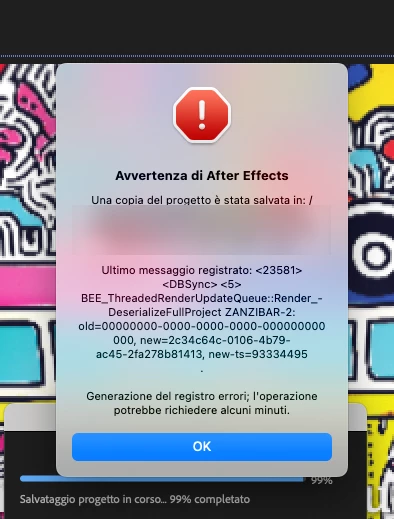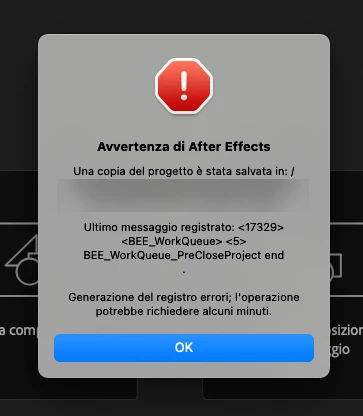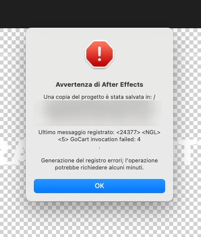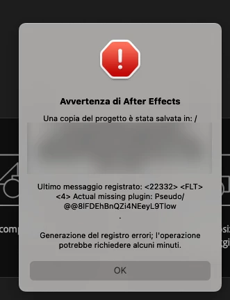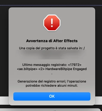 I've been having problems with After Effects on my Mac Studio for a couple of weeks now, the program often crashes with different messages, it won't let me open some projects I made a few months ago, I tried to update the operating system to Sequoia and also reinstall After Effects (last version but previous version too) but the result doesn't change... I'm attaching some screenshots with the details of the various crashes.