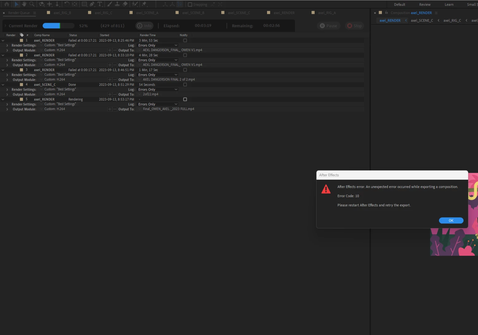 After Effects error:An unexpected error occurred while exporting a composition. Error Code: 10