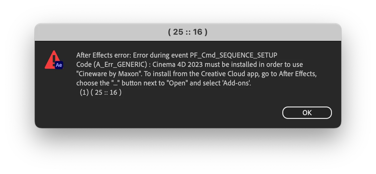 After Effects error: Code (A_Err_GENERIC) with Cineware and AE 23.5
