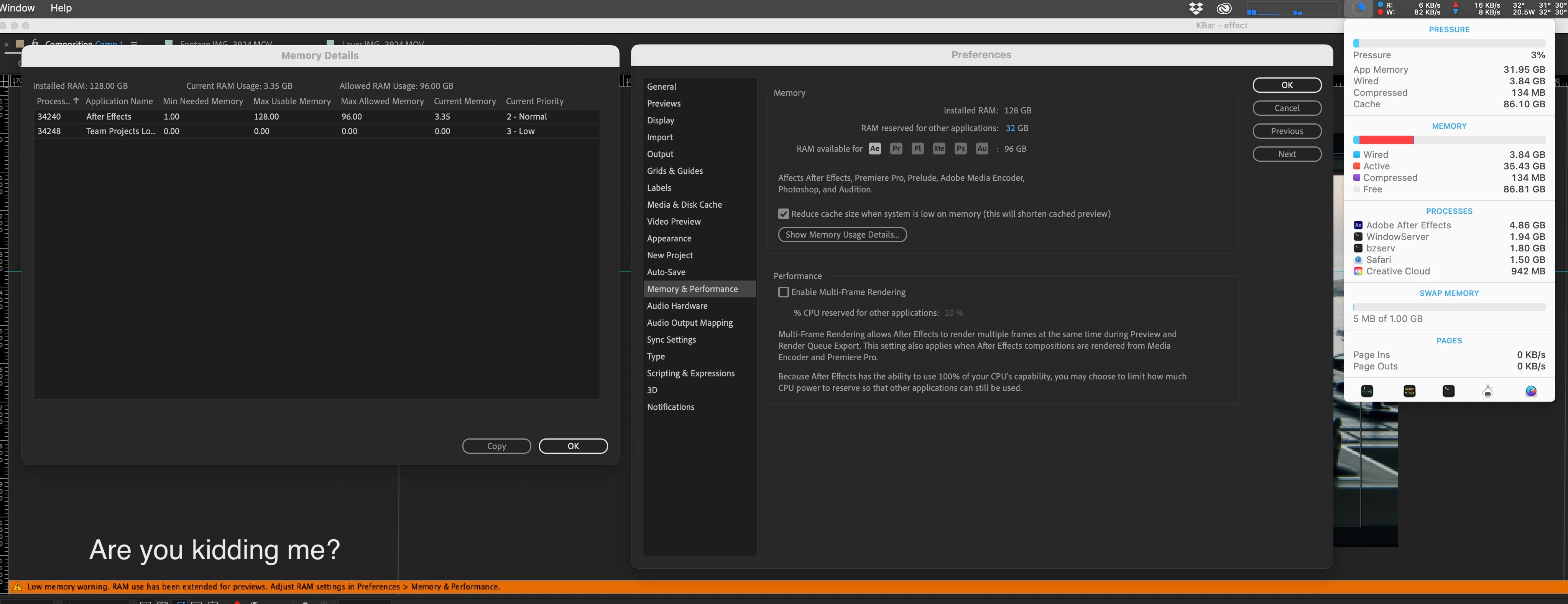 forget about multi frame rendering (slower rendering a lot of the times if it actualy manages to render to the end without stalling), fortget about color accurate hardware acceleration (prores files flicker greenish), just opening a project in a freshly re-started After Effects and I get this warning trying to do a ram preview for a HD comp with a single layer quicktime clip, on quarter resolution. Are you kidding me?