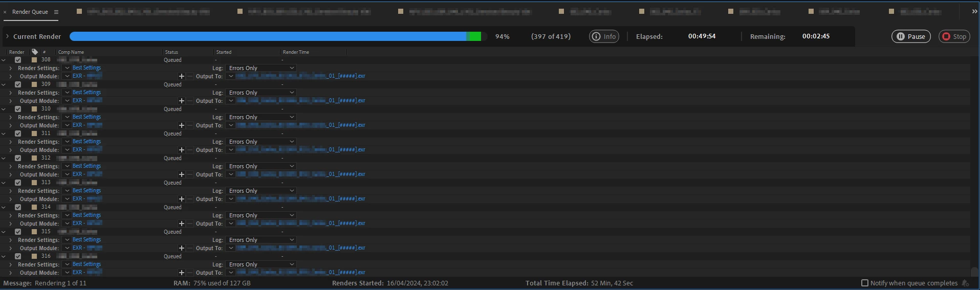 As you can see, the render queue got stuck at the end of the very first render. However, when I went to check the render folder, my surprise is that it seemed done: all the frames were there, with their corresponding information, the sizes were correct and they looked fine. So that's the most strange part. Even though After Effects said only 397 frames were processed, I found the whole 419 of them.